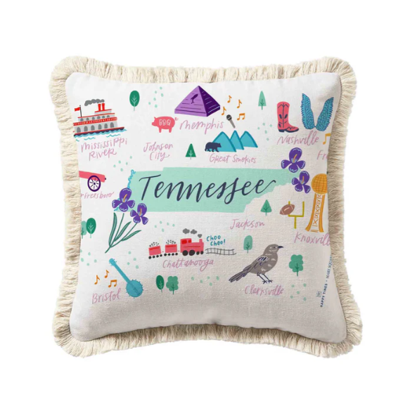 Experience the warmth of the Volunteer State with our Tennessee Square Pillow! Measuring 16" x 16", this pillow isn't just a decor piece—it's a heartfelt tribute to Tennessee's rich history and vibrant culture. Featuring captivating hand-drawn illustrations, modern calligraphy, embroidered accents, printed designs, and a playful outer fringe, this pillow adds a touch of Tennessee's charm to any room.